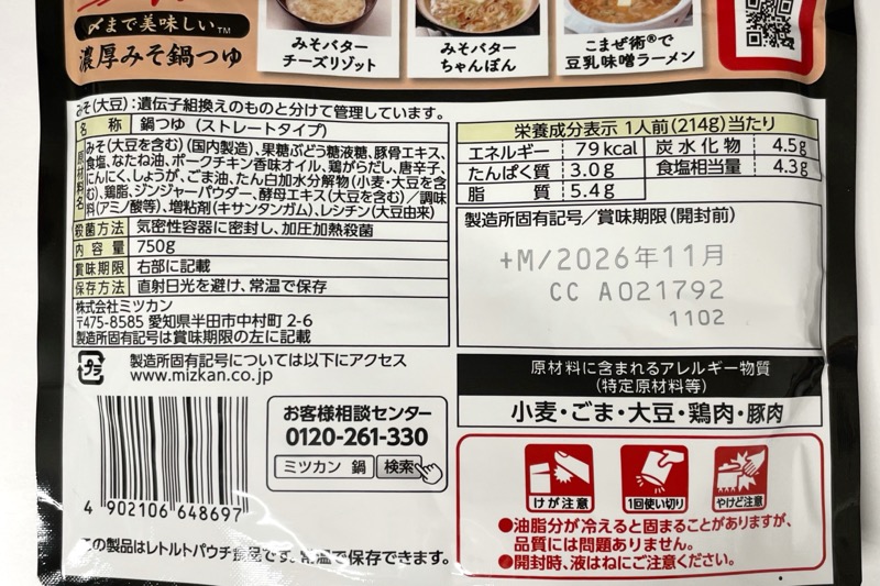 ミツカンの『〆まで美味しい 濃厚みそ鍋つゆ ストレート』がピリ辛な味噌の味で美味しい。