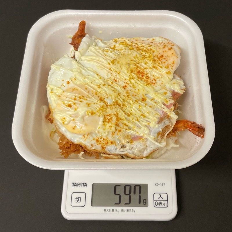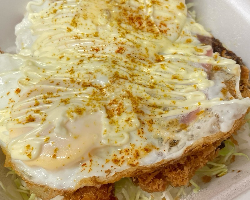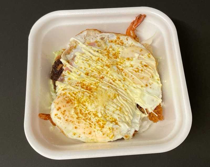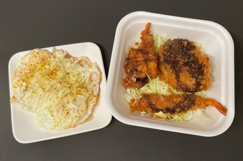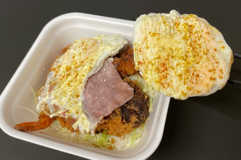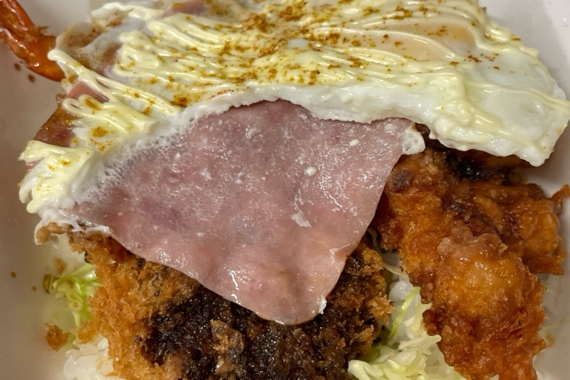 『ハムエッグカツ丼(ハンバーグカツ・海老フライ・から揚げ)』です。