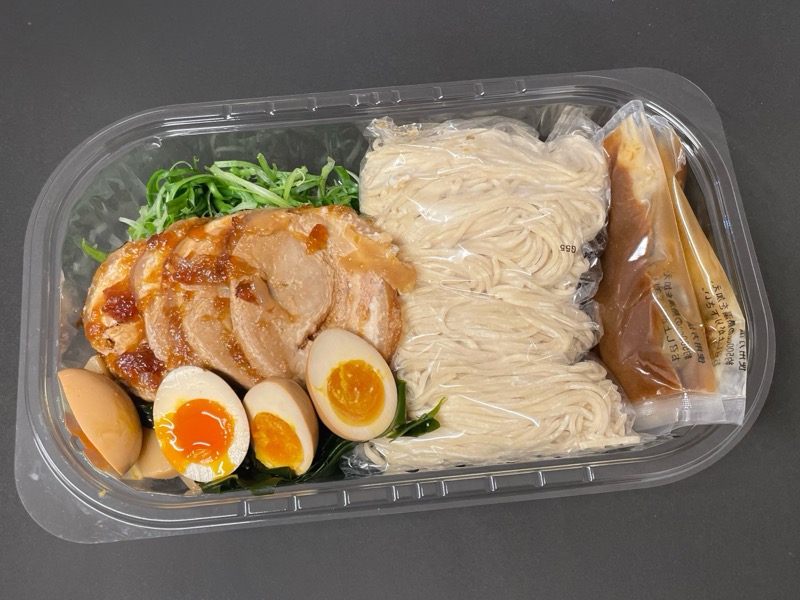 大きなチャーシューと卵、メンマ、ワカメ、ネギがセットになっています。