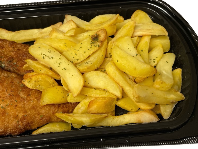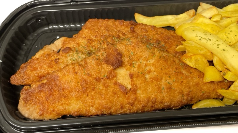 魚のフライとフライドポテトが温かい状態で売っています!