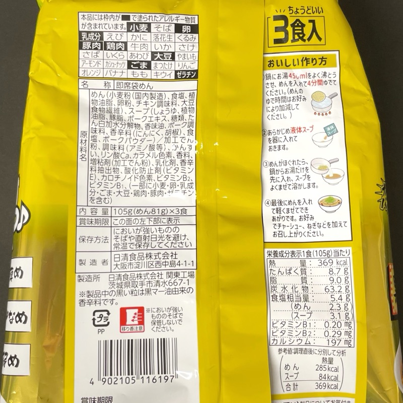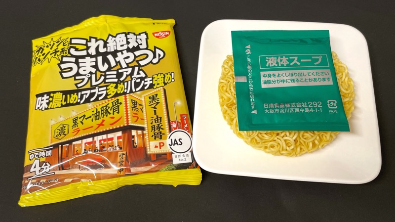 日清食品の『日清これ絶対うまいやつ♪ プレミアム 黒マー油豚骨 3食パック』が濃い油とニンニクでガッツリ!