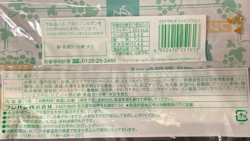 フジパンの『カステラサンド シャインマスカット』が爽やかな味で美味しい!
