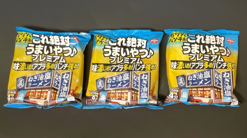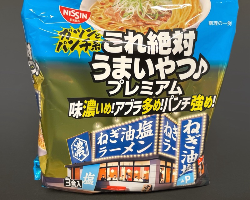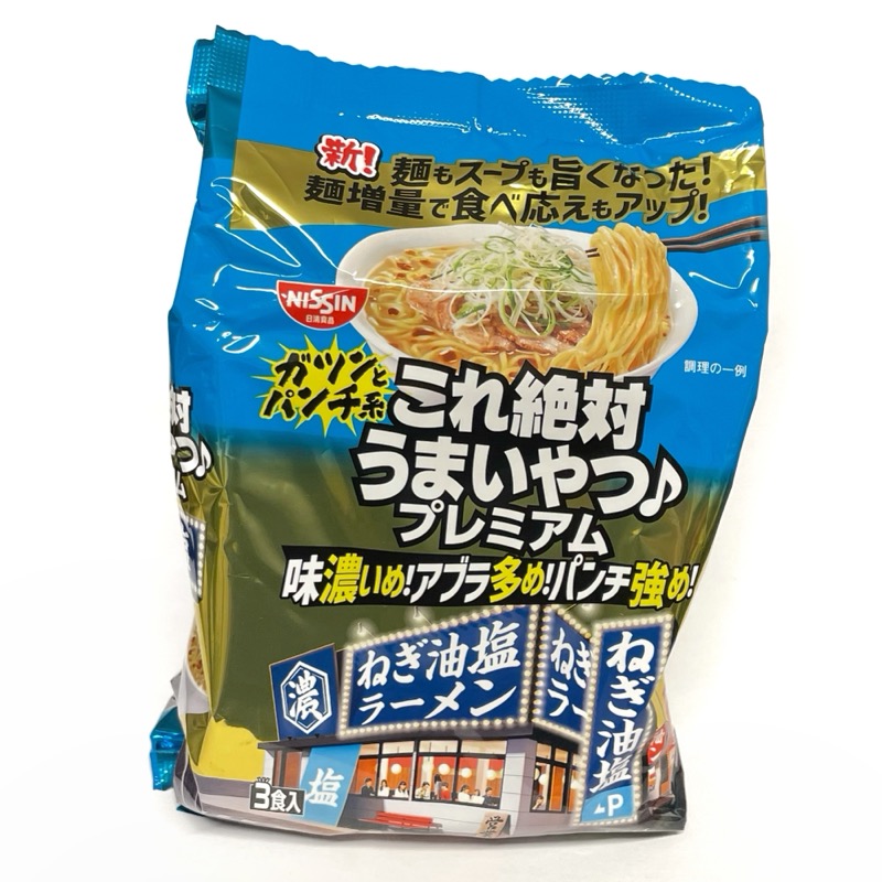 『日清これ絶対うまいやつ♪ プレミアム ねぎ油塩 3食パック』です。