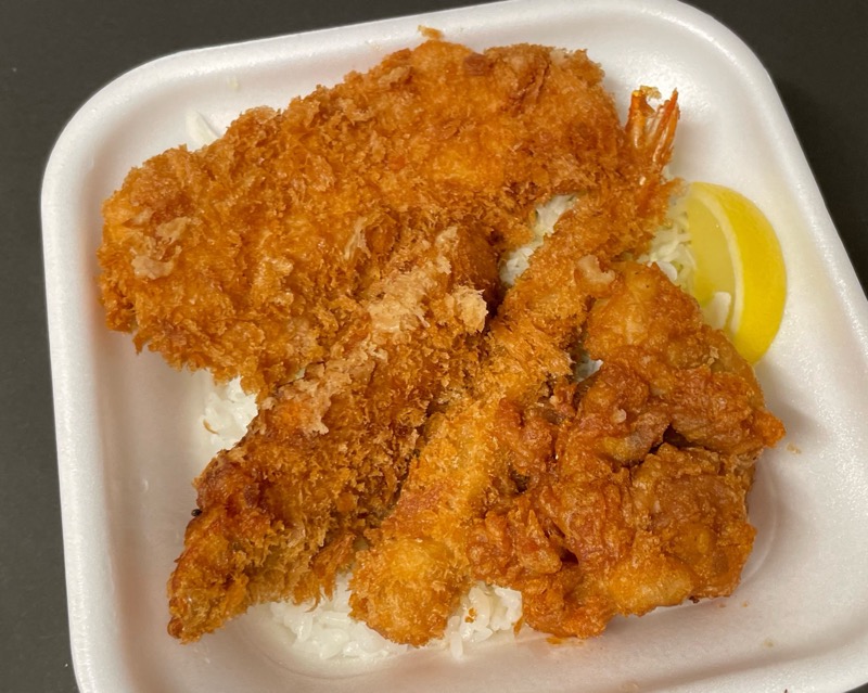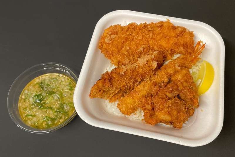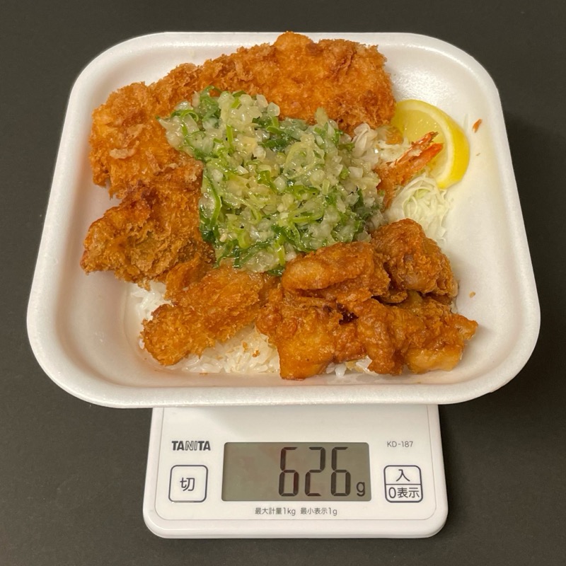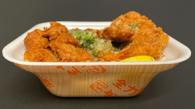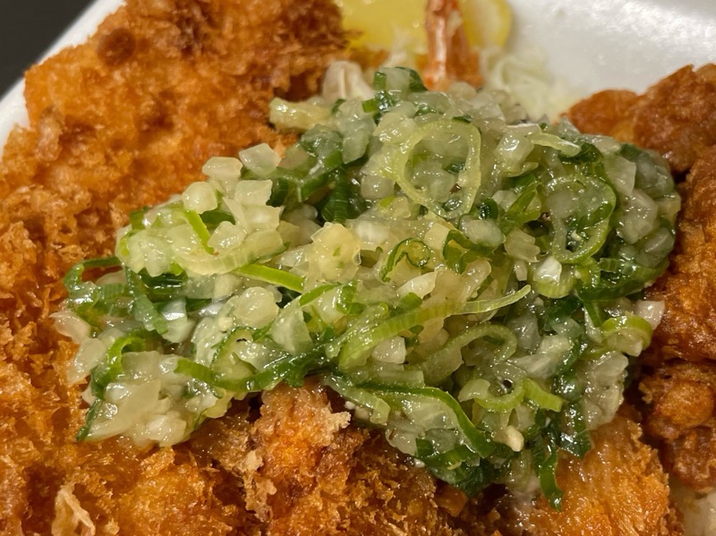 かつやの『ねぎ塩カツ丼』が海老・鮭・鶏ささみ・唐揚げの4種類が乗って美味しい!