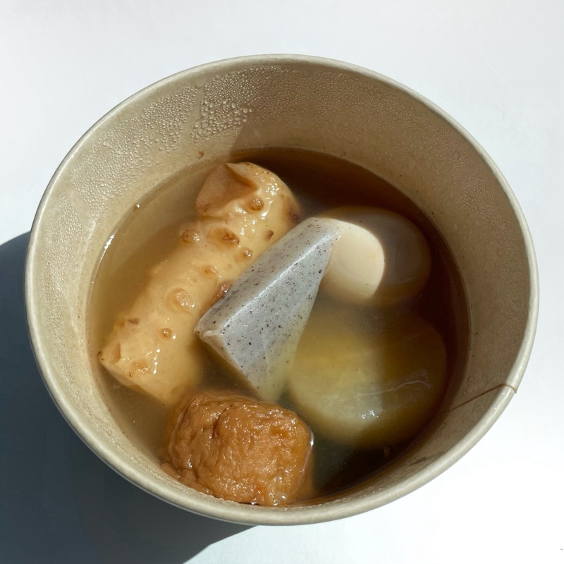 さつま揚げ、こんにゃく、卵、ちくわ、昆布、大根の6種類の具材が入ったおでんです。