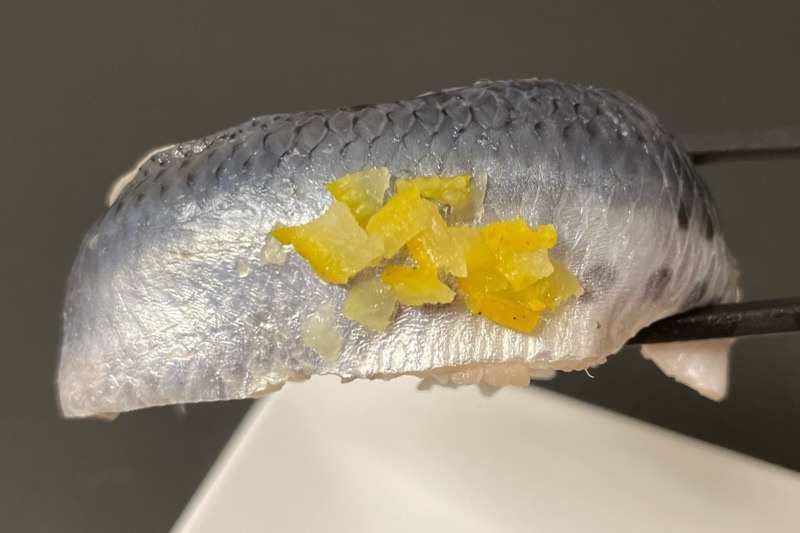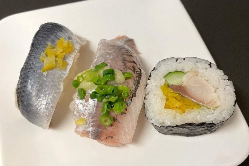 酢じめいわし、真あじ、しめさばたくあん巻です。
